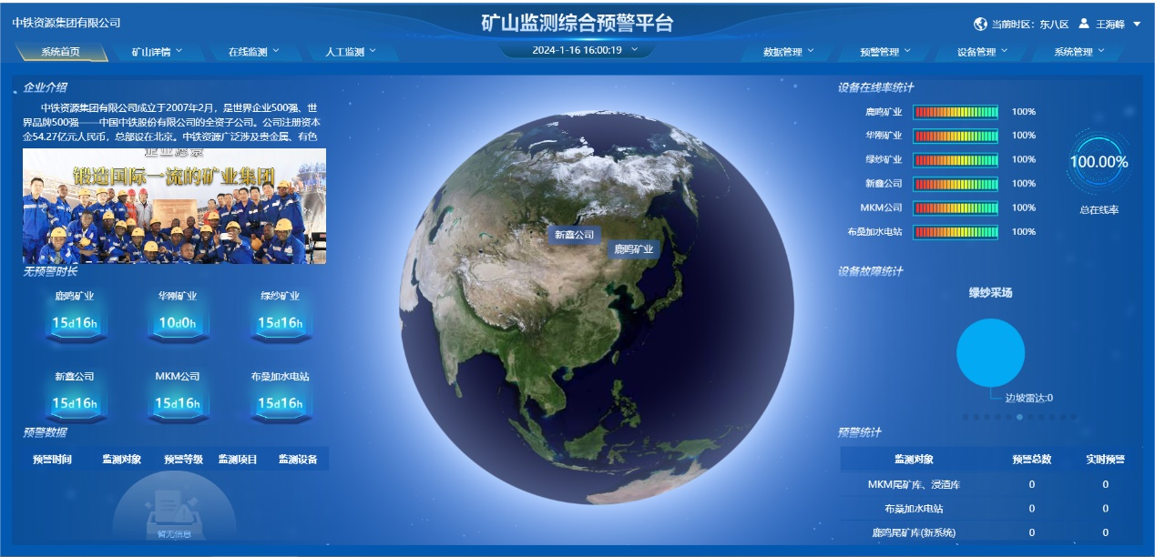 平臺(tái)共分為8個(gè)版塊,“系統(tǒng)首頁”中包括中鐵資源集團(tuán)有限公司簡(jiǎn)介、平臺(tái)監(jiān)測(cè)設(shè)備在線率、各礦山無預(yù)警時(shí)長(zhǎng),各礦山設(shè)備故障情況、各礦山預(yù)警數(shù)量及滾動(dòng)信息;“礦山詳情”模塊包含集團(tuán)公司五大礦山和水電站二級(jí)頁面,展示礦山的整體監(jiān)測(cè)運(yùn)行情況,各監(jiān)測(cè)項(xiàng)目的三級(jí)頁面展示該項(xiàng)目運(yùn)行情況及部分?jǐn)?shù)據(jù);“在線監(jiān)測(cè)”模塊包含按監(jiān)測(cè)種類歸集的各項(xiàng)目數(shù)據(jù),可查看所有在線監(jiān)測(cè)項(xiàng)目的測(cè)量值和變化速率的實(shí)時(shí)數(shù)據(jù)與歷史數(shù)據(jù),并形成變化趨勢(shì)圖供技術(shù)人員參考;“人工監(jiān)測(cè)”模塊包含各監(jiān)測(cè)項(xiàng)目人工巡視后上傳的現(xiàn)場(chǎng)資料、人工監(jiān)測(cè)項(xiàng)目的測(cè)點(diǎn)位置和數(shù)據(jù)信息;“數(shù)據(jù)管理”模塊中包含各監(jiān)測(cè)項(xiàng)目數(shù)據(jù)查詢展示功能,可實(shí)現(xiàn)不同類型設(shè)備多點(diǎn)位數(shù)據(jù)展示,可以直觀的呈現(xiàn)測(cè)點(diǎn)及斷面整體數(shù)據(jù)情況,為技術(shù)人員分析研判提供數(shù)據(jù)支撐;“預(yù)警管理”模塊包括預(yù)警閾值配置、異常過濾算法、實(shí)時(shí)預(yù)警通知和策略配置功能,預(yù)警通知將會(huì)通過中鐵e通統(tǒng)一消息推送至集團(tuán)公司、礦山業(yè)主和現(xiàn)場(chǎng)工作人員;“設(shè)備管理”模塊中包含設(shè)備狀態(tài)信息、設(shè)備故障處理及記錄,現(xiàn)場(chǎng)設(shè)備與平臺(tái)的數(shù)據(jù)連接中斷后也會(huì)通過中鐵e通推送給現(xiàn)場(chǎng)人員,及時(shí)恢復(fù)與平臺(tái)的連接;“系統(tǒng)管理”模塊中包括用戶管理、角色管理、用戶組管理等用于系統(tǒng)維護(hù)方面的功能,還包括值班管理,可由各項(xiàng)目現(xiàn)場(chǎng)值班人員在系統(tǒng)內(nèi)打卡,便于平臺(tái)運(yùn)維與現(xiàn)場(chǎng)溝通聯(lián)絡(luò)。